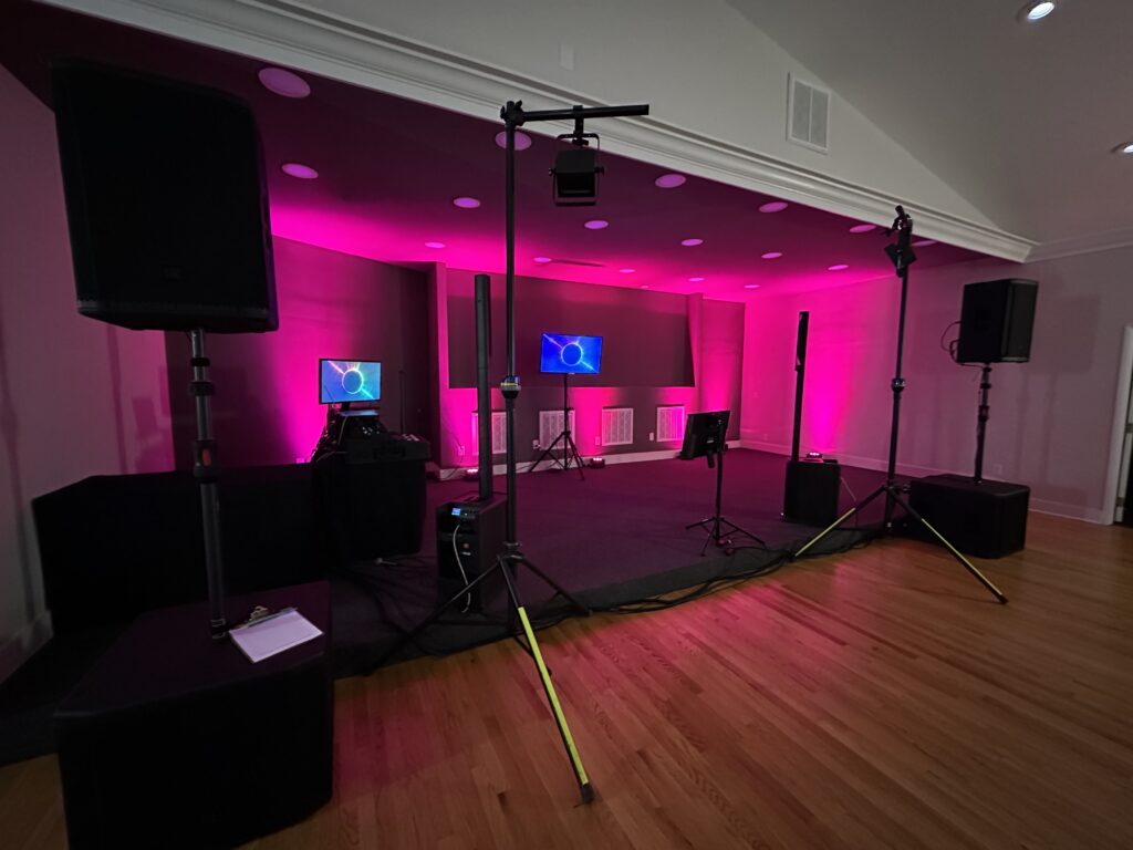 Dan McDermott’s Route 11 DJ stage is set up for Karaoke right after a delicious buffet dinner at The Apple House of Linden, Va. Staff Christmas Party held 12/4/2023 at The Links Club House at Shenandoah Valley Country Club.